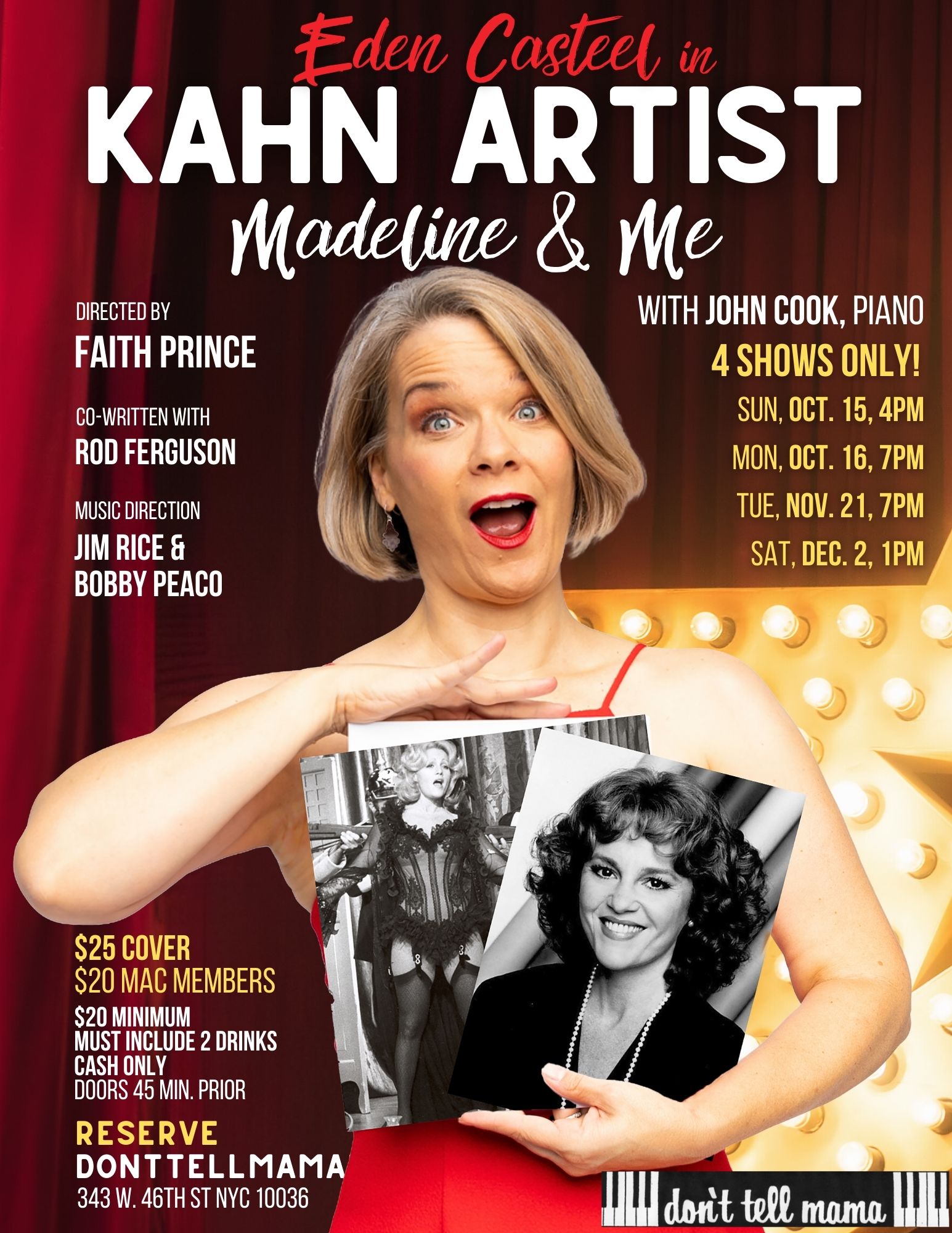 Eden Casteel was a frustrated teenage soprano in Ohio whose life was forever changed by a Madeline Kahn beer commercial (it was Michelob). In 30 seconds, Casteel knew she wanted to be like Kahn: ”Wealthy, glamorous, with an unbelieveable singing voice.” (Two out of three ain’t bad!) Kahn, of course, was the beloved star of some of Mel Brooks’ most popular movies (Blazing Saddles, Young Frankenstein). Filled with iconic songs, compelling stories, and hilarious anectdotes, KAHN ARTIST: MADELINE AND ME is an intimate look at the trials and triumphs of both Kahn and Casteel. With John Cook, Piano. Directed by Faith Prince, cowritten with Roderick Ferguson, with musical arrangements by Jim Rice and Bobby Peaco.