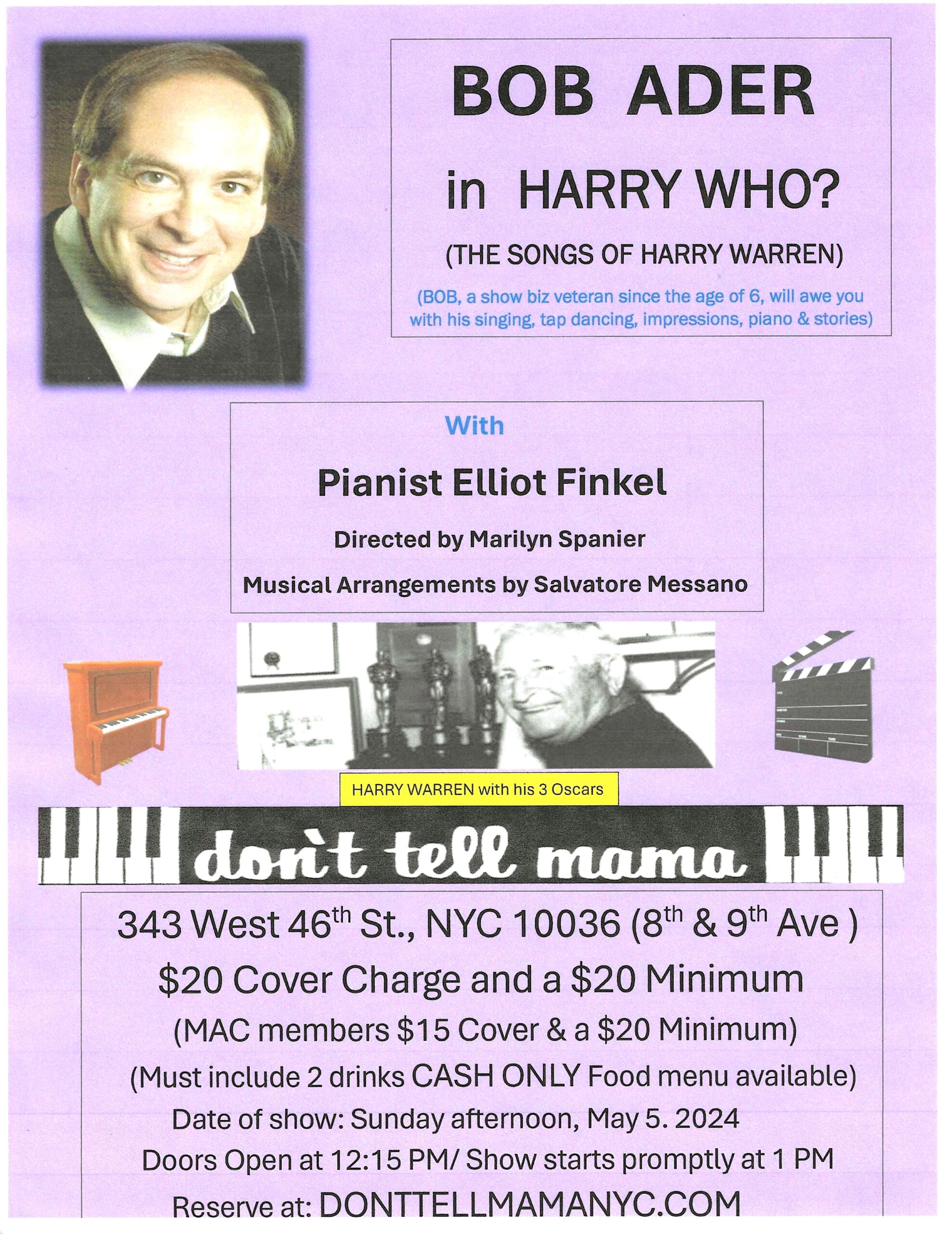 Because of rave reviews and popular demand, Bob Ader will once again be performing, for one day only, his cabaret show, Harry Who? – The Songs of Harry Warren at Don’t Tell Mama, 343 west 46th Street, NYC at 1pm on May 5th, 2024. Here is a link to just one of the rave reviews Bob received for this show. https://nitelifeexchange.com/bob-aders-harry-who-at-dont…/ Once again Bob will be accompanied on the piano by the fabulous Elliot Finkel. The show is directed by Marilyn Spanier and musical arrangements are by Salvatore Messano. $20 cover ($15 for MAC members) and a $20 minimum which must include two drinks. CASH ONLY!