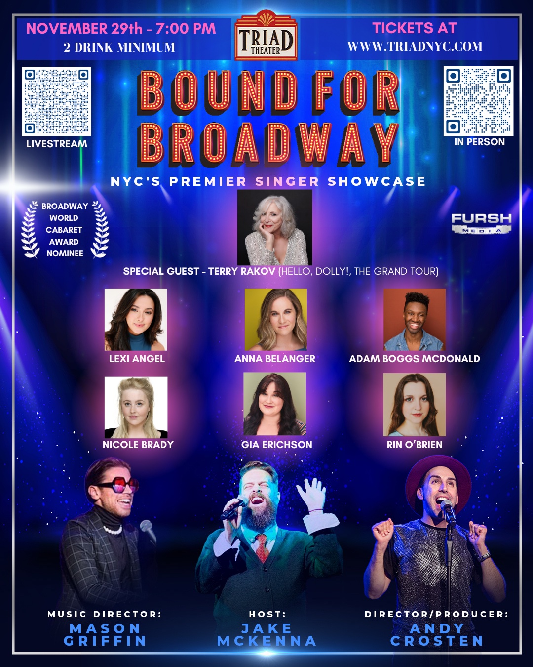 NYC’s premier singer showcase featuring Terry Rakov as the special guest along with the brightest stars of tomorrow. Join us Nov. 29th at the beautiful Triad Theatre on 72nd Street.