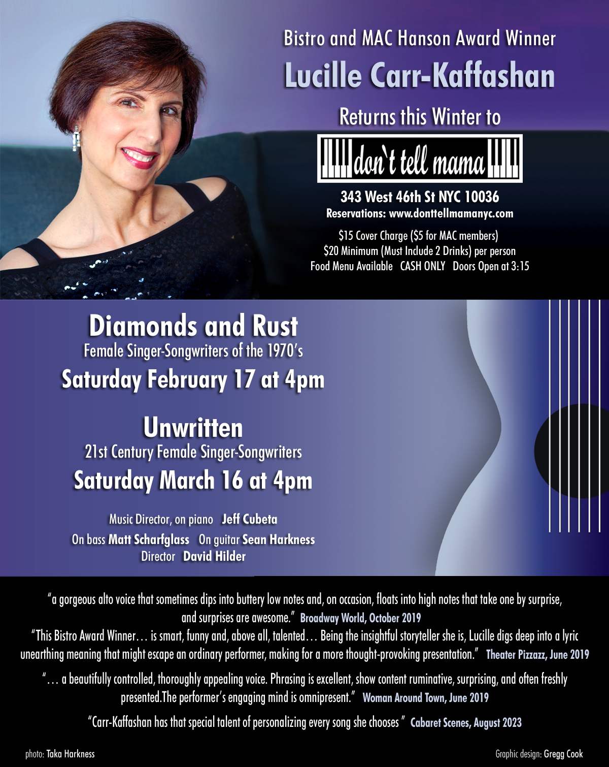 Diamonds and Rust, Female Singer-Songwriters of the 1970’s is a tribute to the women who flourished during the golden age of singer-songwriters, and includes songs by Janis Ian, Joni Mitchell, Carly Simon, Melanie Safka, Carole King, and others.