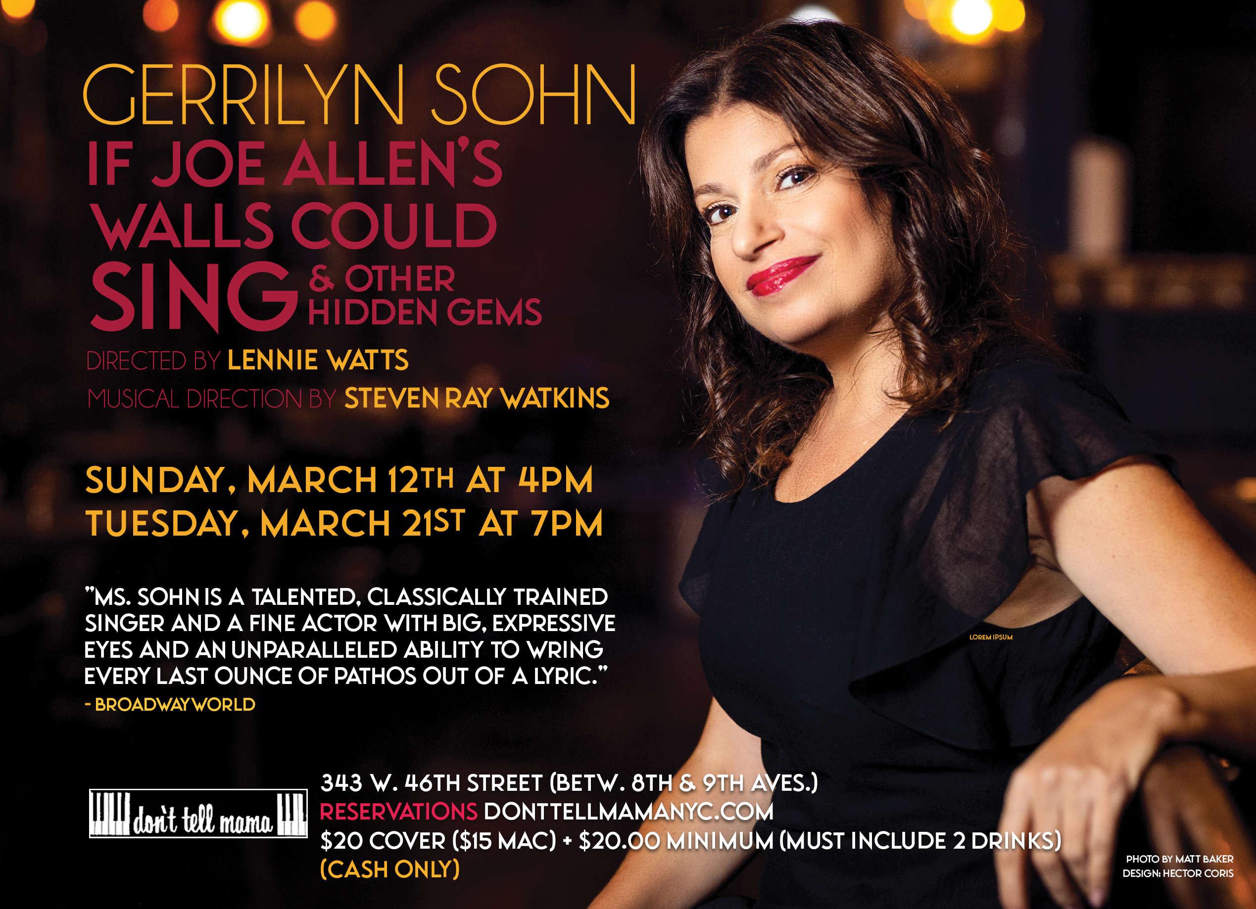 Gerrilyn Sohn returns to Don’t Tell Mama with “If Joe Allen’s Walls Could Sing & Other Hidden Gems” on Sunday, March 12 at 4pm & Tuesday, March 21st at 7pm.