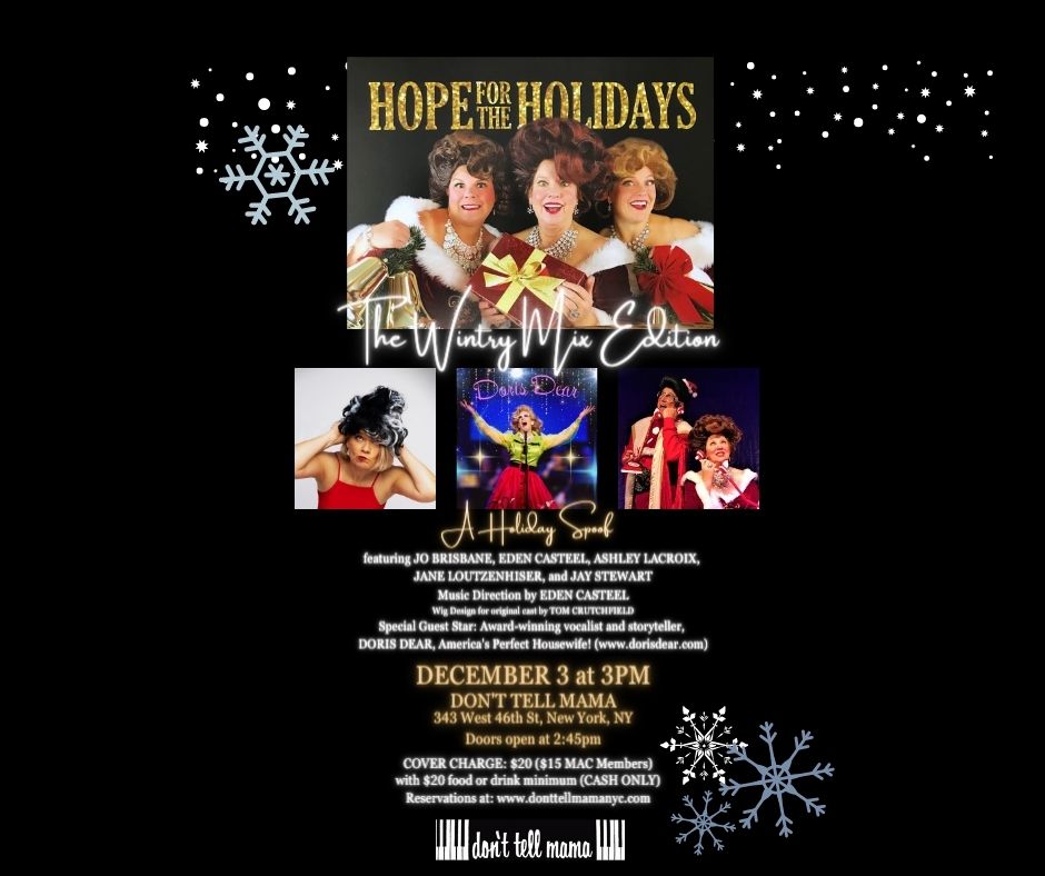 $15 for MAC Members/$20 general tickets. Come in from the weather and mingle and jingle with the newest edition of Hope for the Holidays – The Wintry Mix Edition! Set somewhere in America in 1962, clueless tv hostess Hope Henderson (Jo Brisbane) presents her cabaret crew of characters including: Misty Tinsel (Eden Casteel), the Sugar Sisters – Candy (Ashley LaCroix) and Taffy (Jane Loutzenhiser); and their shared love, Binaca the Bartender (Jay Stewart). It’s a love quadrangle and Santa saves the day, as he always does. Holiday tunes both familiar and obscure, both heartfelt and irreverent, are sung by the questionable quintet. Jealousy and joy, fueled by Christmas cocktails – becomes a wild wintry mix. The show’s four-city tour includes The Arctic Playhouse (Warwick RI) on November 26 at 2 pm; Cotuit Center for the Arts (Cotuit, MA) on November 29 at 7:30 pm; Don’t Tell Mama (NYC) on December 3 at 3 pm; and The Moonshine Room at Club Café (Boston MA) on December 9 at 6 pm.