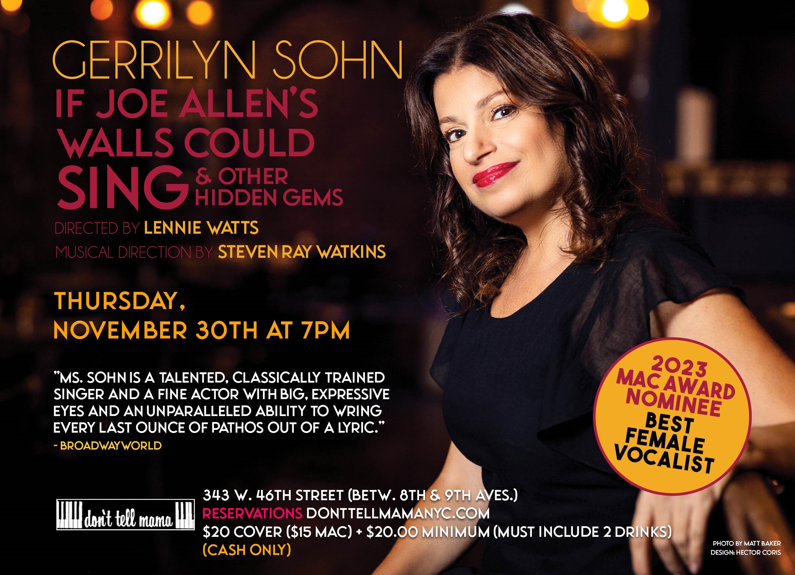 Gerrilyn Sohn returns to Don’t Tell Mama with “If Joe Allen’s Walls Could Sing & Other Hidden Gems” on Thursday, November 30th at 7pm.