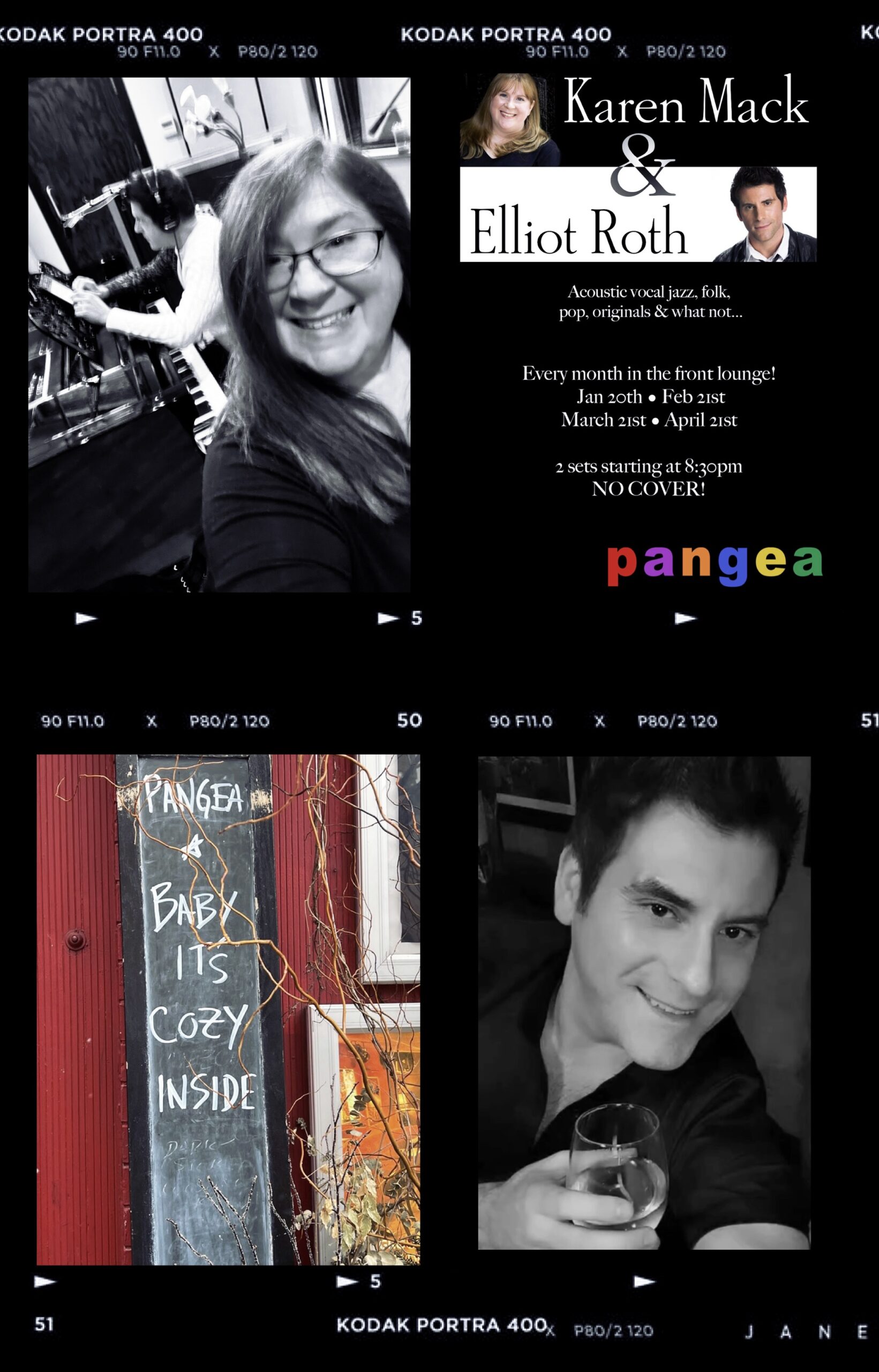 Join popular NYC singer/songwriters Karen Mack & Elliot Roth for 2 sets of acoustic jazz, originals, pop/folk covers, and “not standard” takes on standards in Pangea’s beautiful restaurant/front lounge.