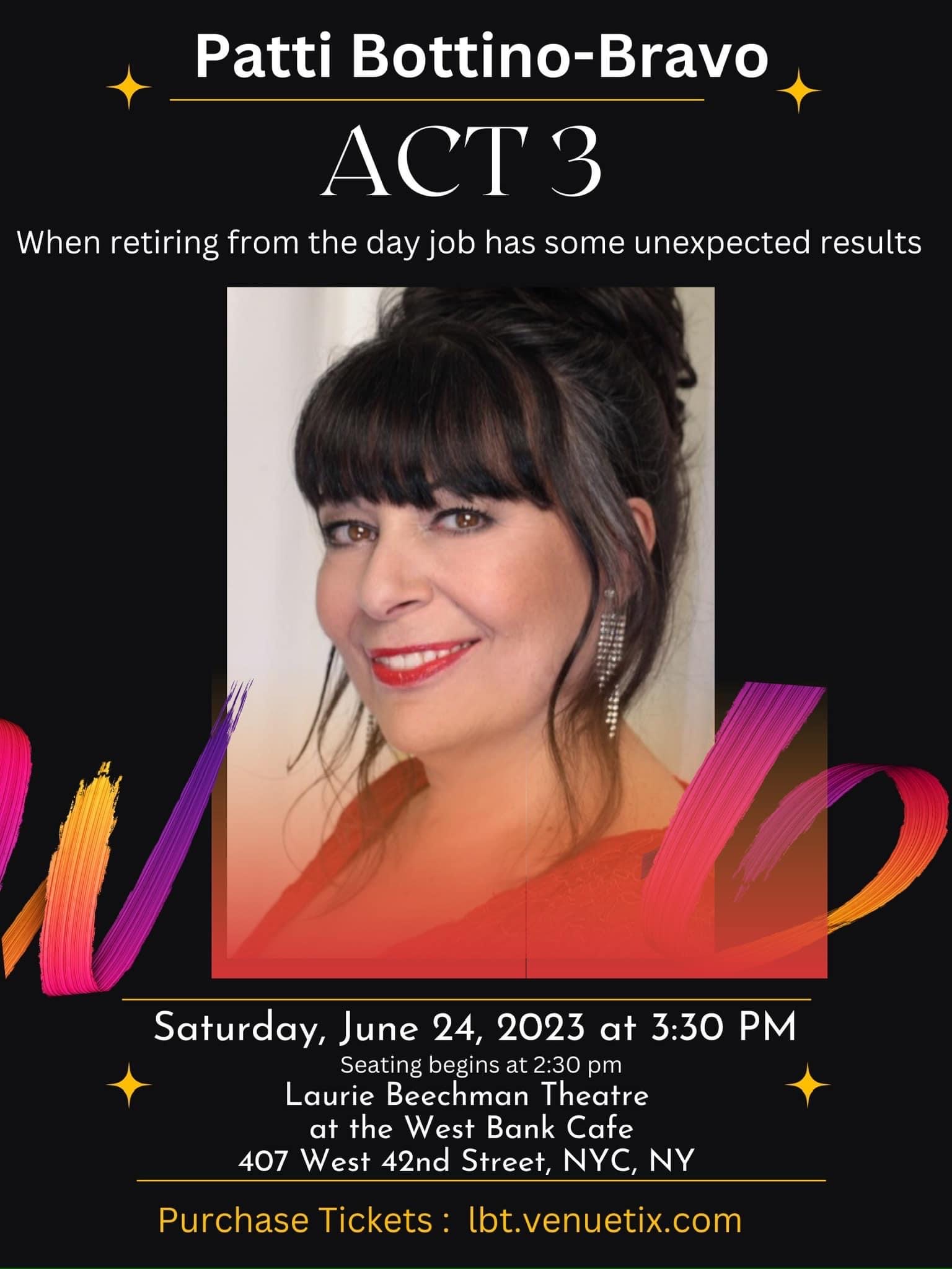 ACT 3 tells the story of one woman’s unexpected reaction to facing retirement and finally doing what she always said she wanted to do. With songs spanning the 1950’s through the 1990’s from musical theater, pop, rock, and jazz genres, you will be delighted by new twists on familiar tunes and some hidden gems! Directed by Lina Koutrakos. Musical Director Gregory Toroian on piano, Skip Ward on bass, David Silliman on drums. Tickets: $25/plus $25 food or drink minimum