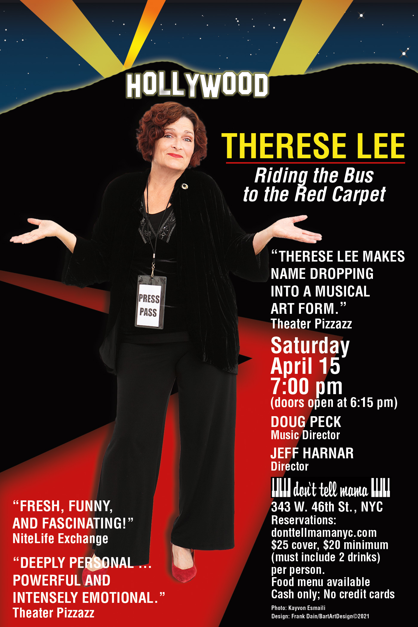 THERESE LEE returns to New York for an encore performance of her new show, RIDING THE BUS TO THE RED CARPET. In it, she recalls her days in Los Angeles as an entertainment reporter too broke to own a car, and shares what her interactions with some of Hollywood’s biggest stars during that time did to change her life forever.