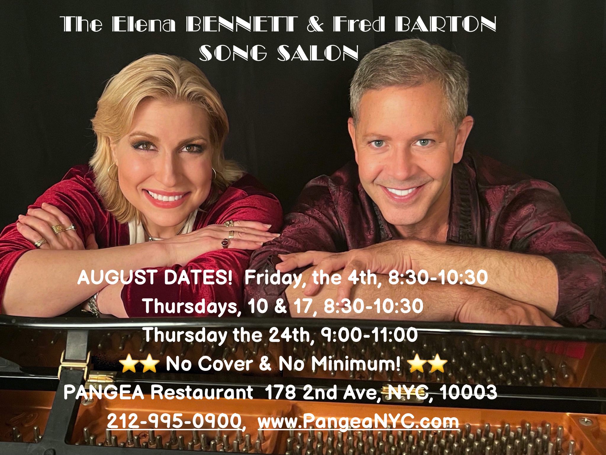 Elena Bennett and Fred Barton continue the run of their long-hailed “Bennett & Barton Song Salon,” in the front room of Pangea, 2nd Ave. at 12th St., Thursdays in August. The event will run for two hours on each night, between 8:30pm and 10:30pm. There is no cover or minimum.