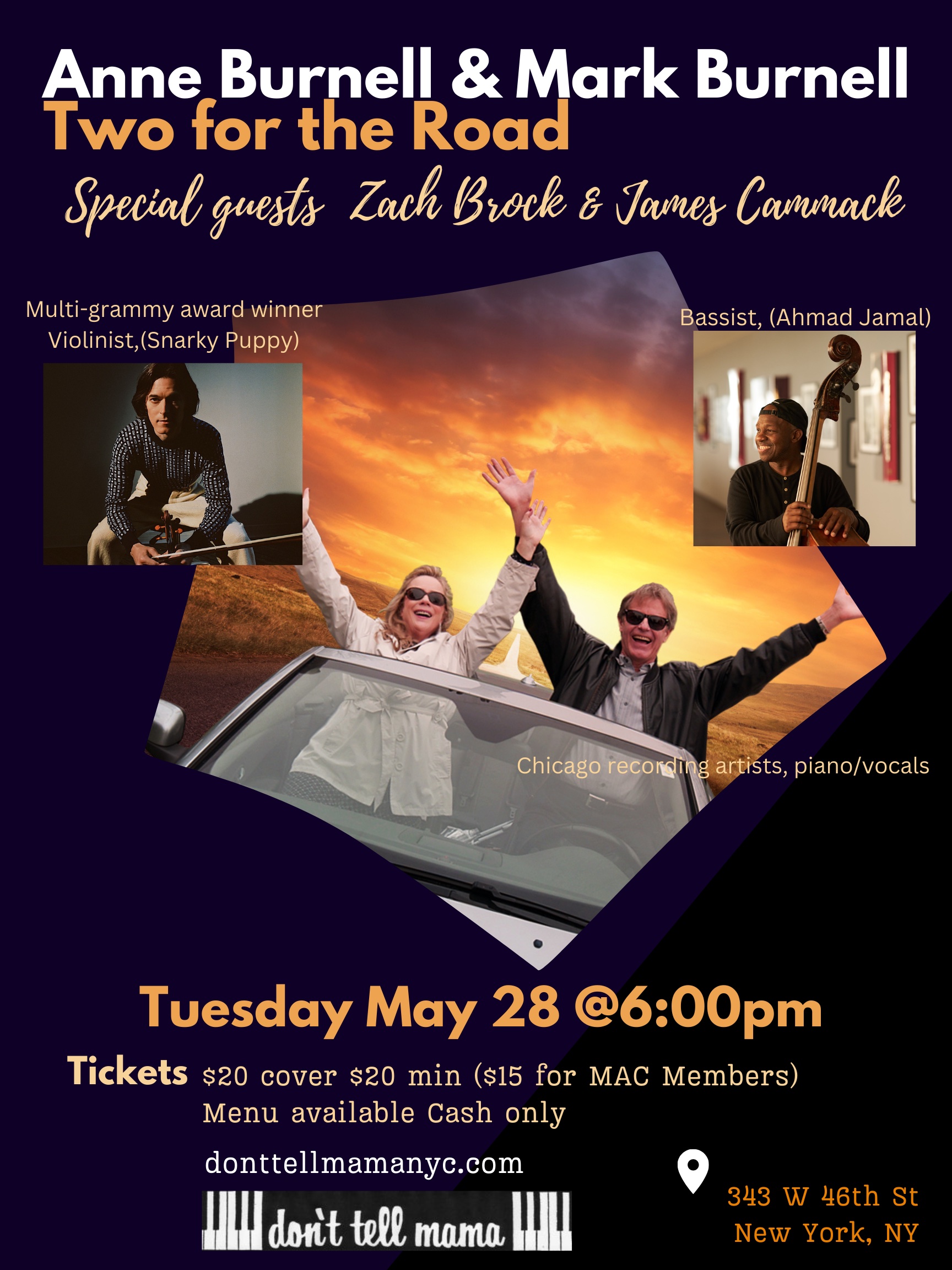 Chicago recording artists Anne & Mark Burnell return to NYC after 20 years. They are touring their album “Two for the Road” which garnered airplay on over 100 jazz and NPR stations and their new single “The Lusty Month of May” with a LBGTQ+ and second line spin! They are collaborating with long-time friend and bassist James Cammack (Ahmad Jamal) and Multi Grammy Award winning violinist Zack Brock (Snarky Puppy). Cabaret, jazz, fusion, this show is not to be missed!