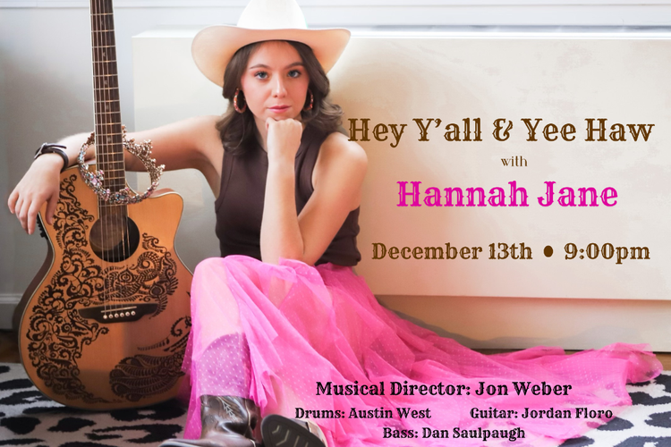 Bringing a little country to the city, Award-winning cabaret artist Hannah Jane is debuting her first ever country show, “Hey Ya’ll and Yee Haw.” Backed by heartwarming stories of the music that made her, she will feature the Queens of Country Music from the 90’s through today that have dominated country music radio across the world. Reliving some of her most vivid childhood memories and the role that country music played in the background of it all, Hannah Jane will have you tapping your toe one minute, singing along to legendary songs the next and maybe shedding a tear or two before it’s all over. She’s been called “the future of Broadway” by NYC critics, and after this show you are going to see why they have also called her “one of the most versatile talents to be seen on Manhattan stages in a very long time.” Come and see for yourself where Hannah Jane got her nickname, the Southern Sweetheart of NYC. To learn more: www.hannahjane.nyc. Musical Director: Jon Weber with Jordan Floro on guitar, Dan Saulpaugh on bass, Austin West on drums and Special Guest: Coco Cohn.