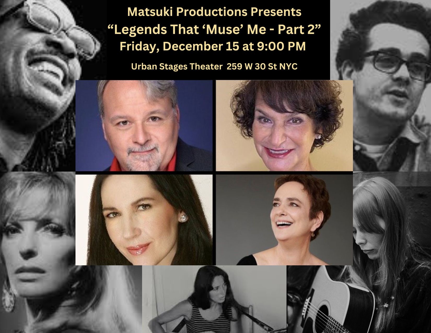 FRIDAY, DECEMBER 15 @ 9:00PM, Matsuki Productions Presents: Legends That “Muse” Me – Part 2, featuring FRED AIESE (Stevie Wonder), JACKIE DRAPER (Michel Legrand), KATI NEIHEISEL (Julie London) and DEBORAH STONE (Joni Mitchell / Joan Baez). Musical Director: Gregory Toroian with Skip Ward on bass. Tickets $35, pair this with “Legends that ‘Muse’ Me – Part 1,” FRIDAY, DECEMBER 15 @ 7:00PM, and get a Special Two-Show Price of $60: https://urban-stages.ticketleap.com/dec15-bothshows/