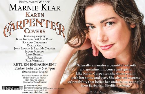 Marnie Klar: Karen Carpenter Covers Bistro Award Winner 3 Time MAC Award Nominee Featuring Songs By: Burt Bacharach & Hal David Richard Carpenter Carole King John Lennon & Paul McCartney […]