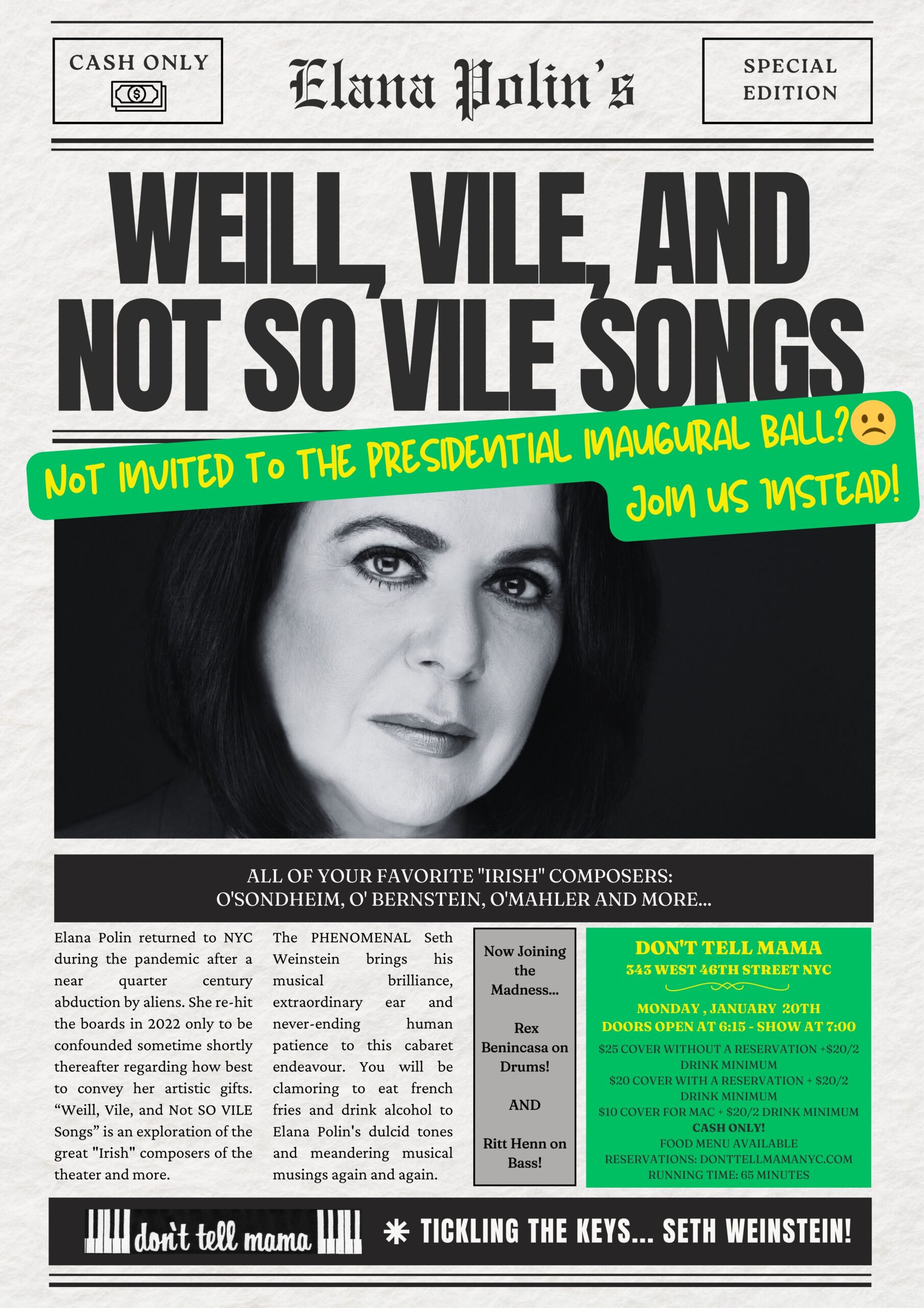 ELANA POLIN SINGS ALL OF YOUR FAVORITE "IRISH" COMPOSERS:  O'SONDHEIM, O'BERNSTEIN, O'MAHLER AND MORE ON INAUGURATION BALL NIGHT...WITH SETH WEINSTEIN TICKLING THE KEYS, REX BENINCASA ON DRUMS AND RITT HENN ON BASS! NO COVER MAC!
