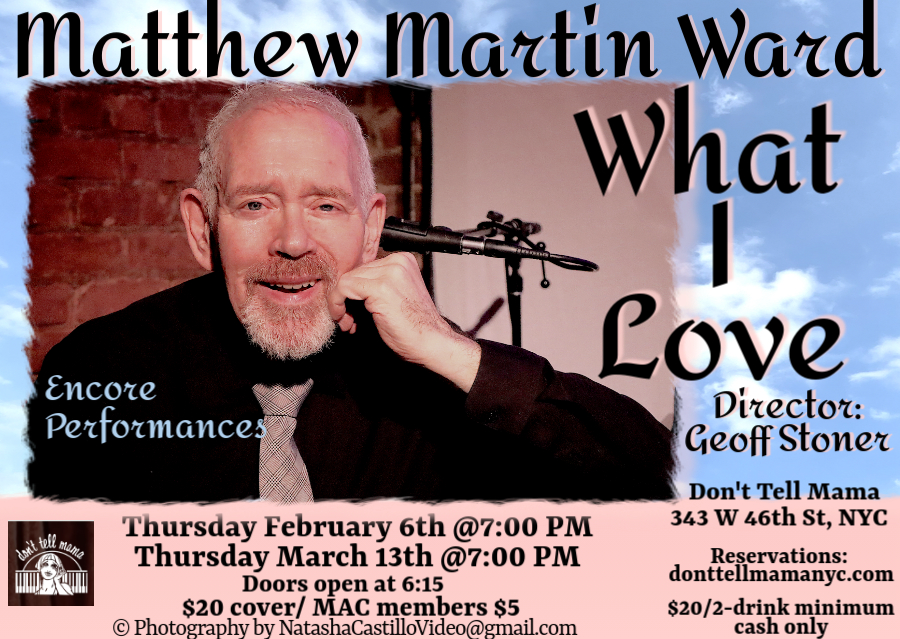 MAMAWA Productions presents MATTHEW MARTIN WARD in WHAT I LOVE   MATTHEW MARTIN WARD, selected as one of the Top Cabaret Artists of 2024 by Jacqueline Parker of Times Square Chronicles, returns to Don't Tell Mama on Thursdays, February 6 & March 13 at 7:00 PM!   After 50 years in the business, beloved Singer, Songwriter and […]