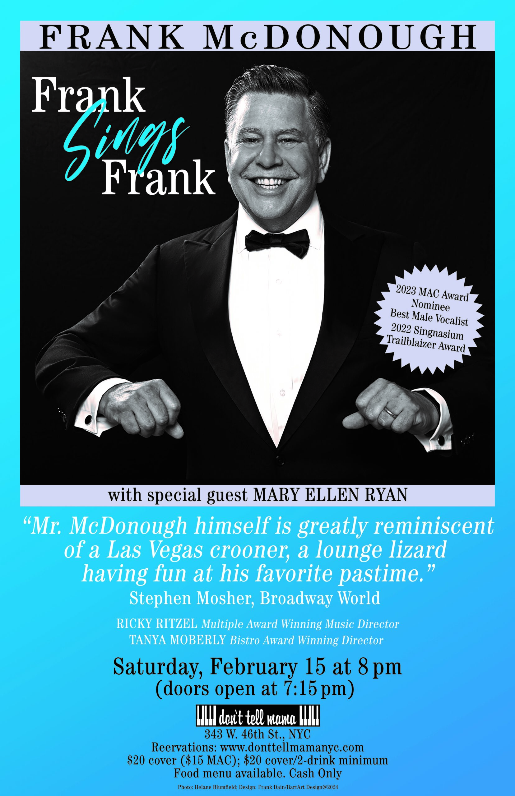 Saturday, February 15th @ 8 p.m. - doors open at 7:15 Don’t Tell Mama, 343 West 46th Street, NYC 2023 Mac Award Nominee for Best Male Vocalist 2022 Singnasium’s Trailblazer Award Frank McDonough with special guest Mary Ellen Ryan Bistro Award Winning Director Tanya Moberly Multiple Award Winning Music Director Ricky Ritzel $20 cover ($15 […]