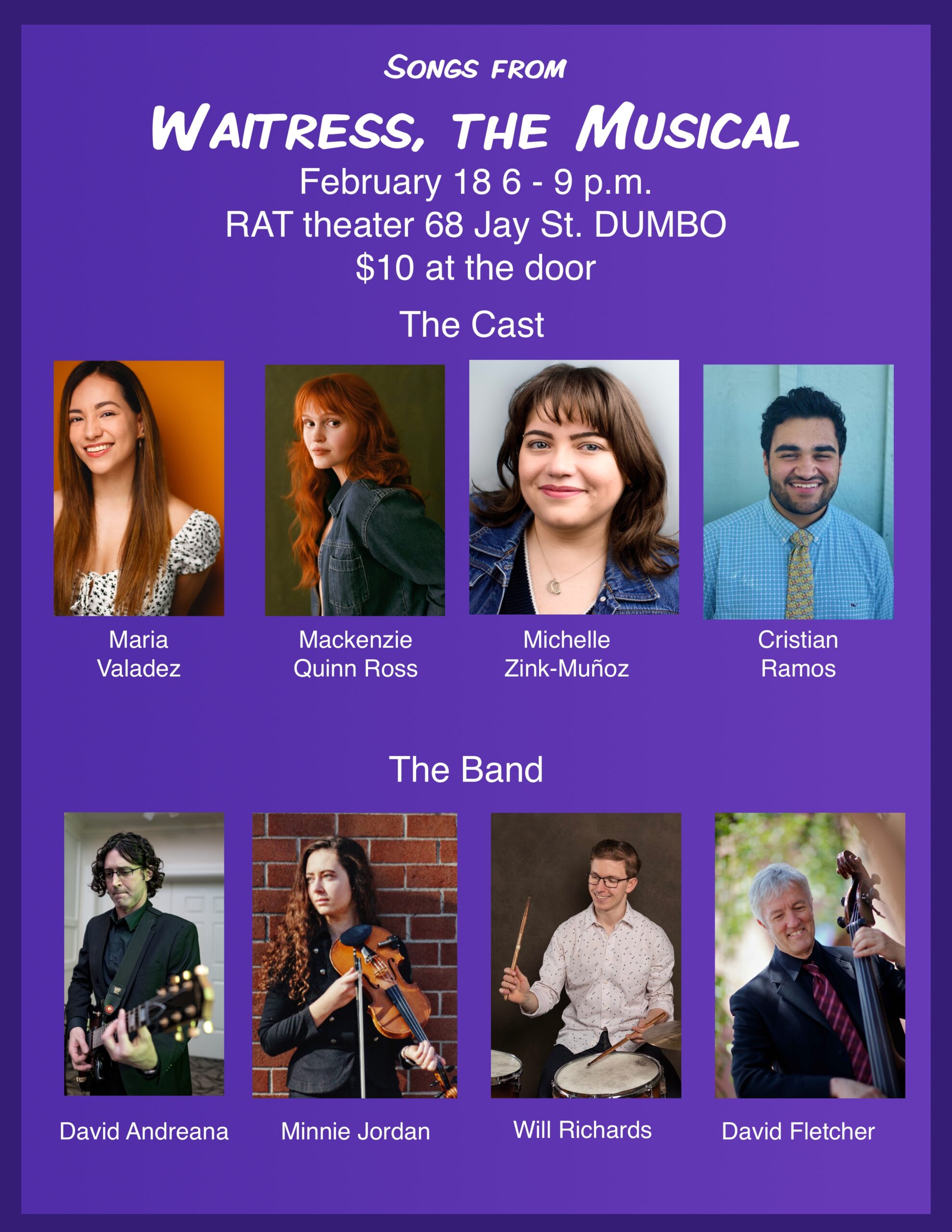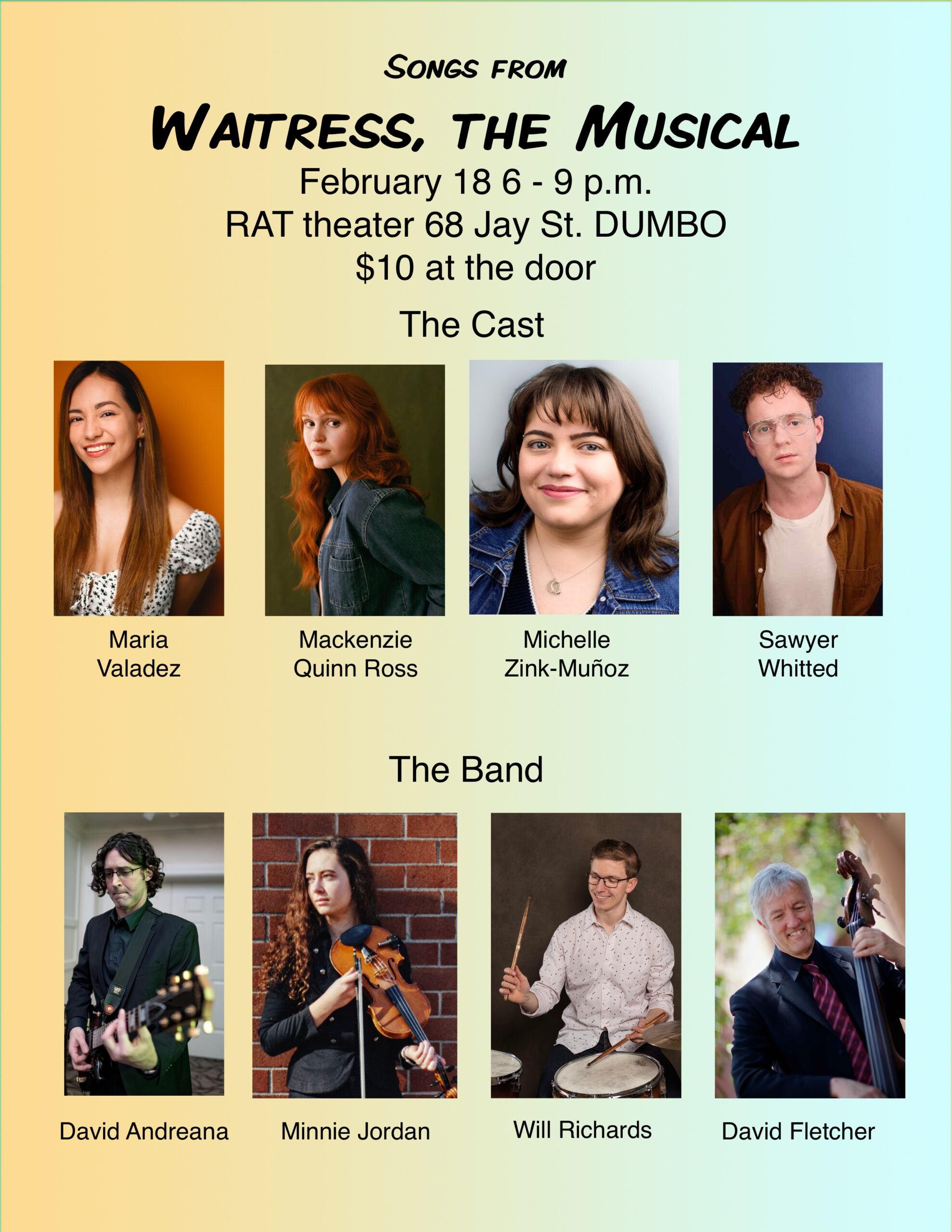 Songs from Waitress, the Musical featuring Broadway's next stars Maria Valadez (Jenna)  Mackenzie Quinn Ross (Dawn)  Michelle Zink-Munoz (Becky) and Cristian Ramos (Dr. Pommater) accompanied by David Andreana (guitar)  Will Richards (drums) and David Fletcher (keys)  $10 at the RAT theater 68 Jay St. Dumbo opening act the Minnie Jordan  (www.minniejordan.com) jazz violinist