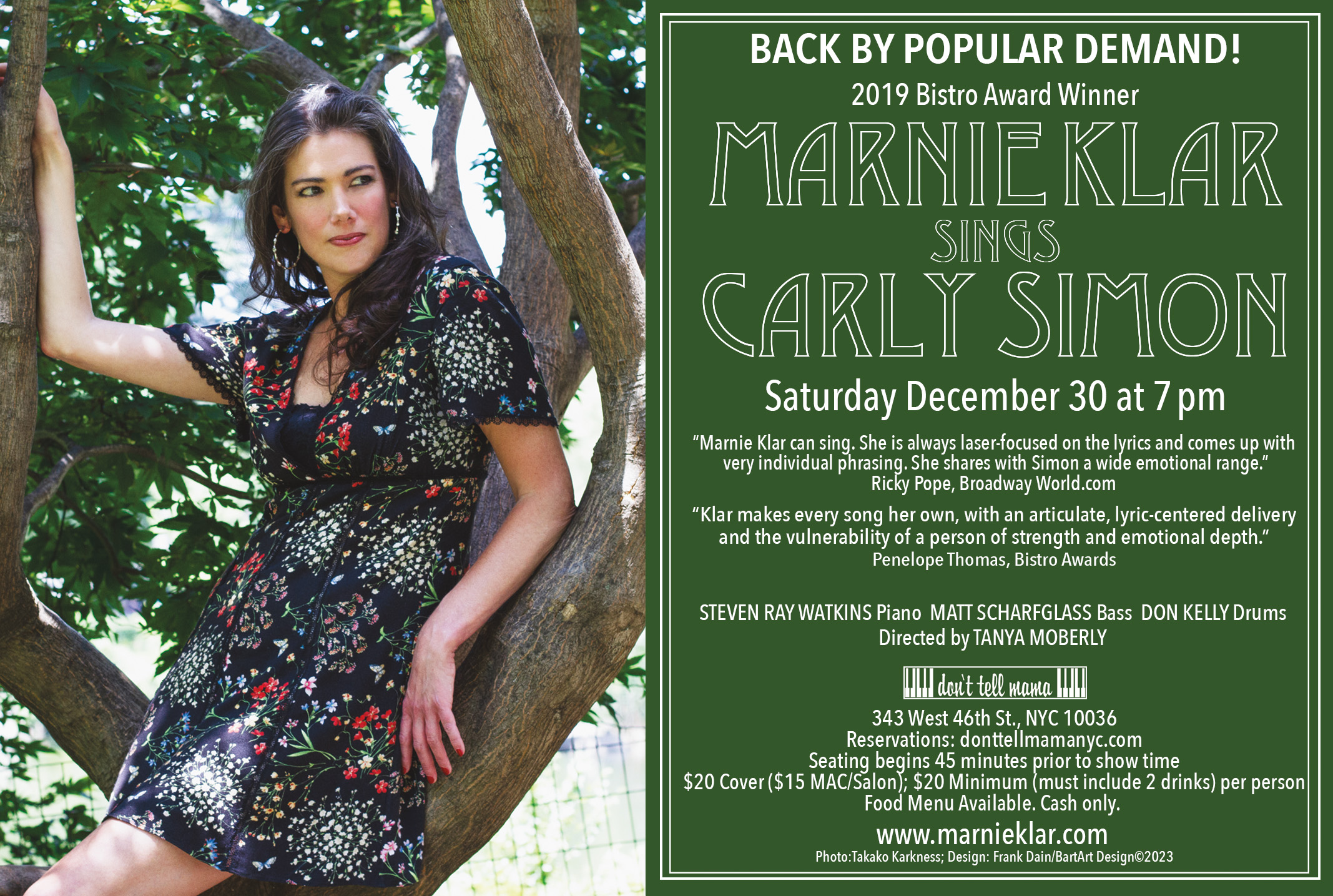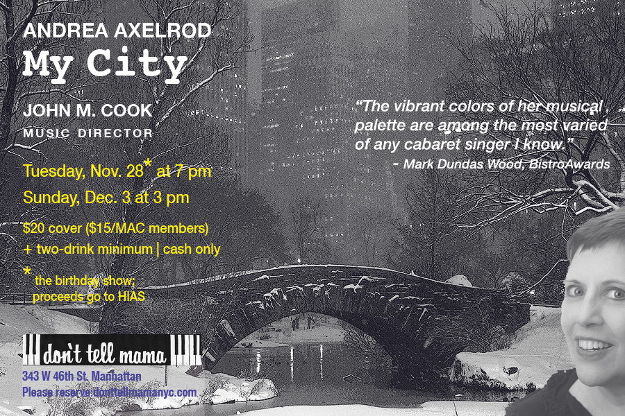 MAC-nominee Andrea Axelrod returns to Don’t Tell Mama with My City, a new show reflecting her love of a vanishing, mythologized New York – her city -- on Tuesday, November 28, 2023 at 7 and Sunday, December 3, 2023 at 3. John M. Cook is music director, pianist and occasional singer in this celebration of […]